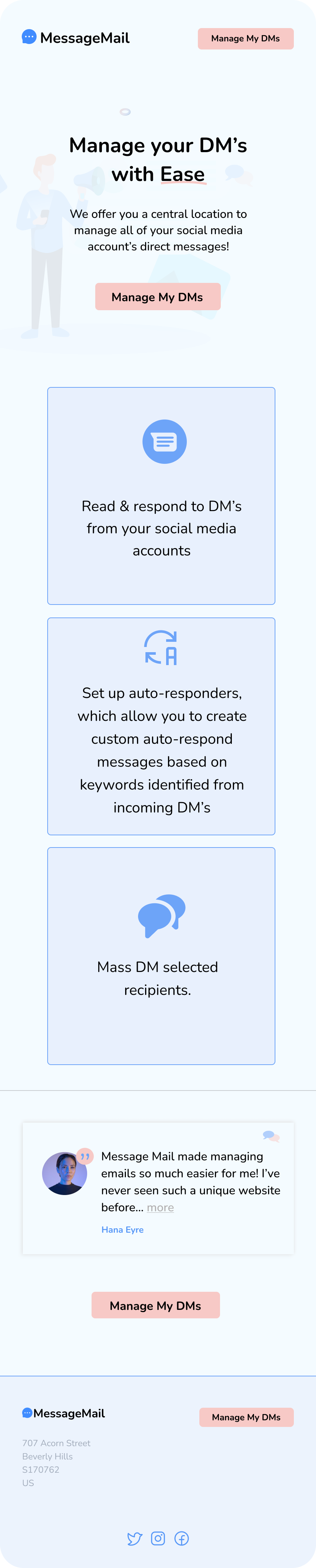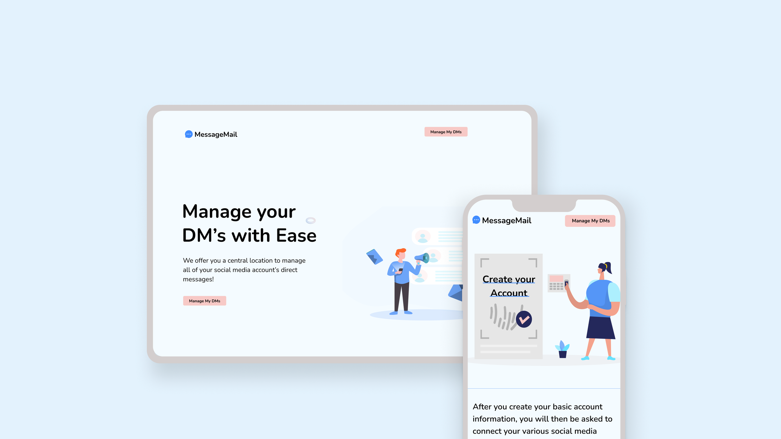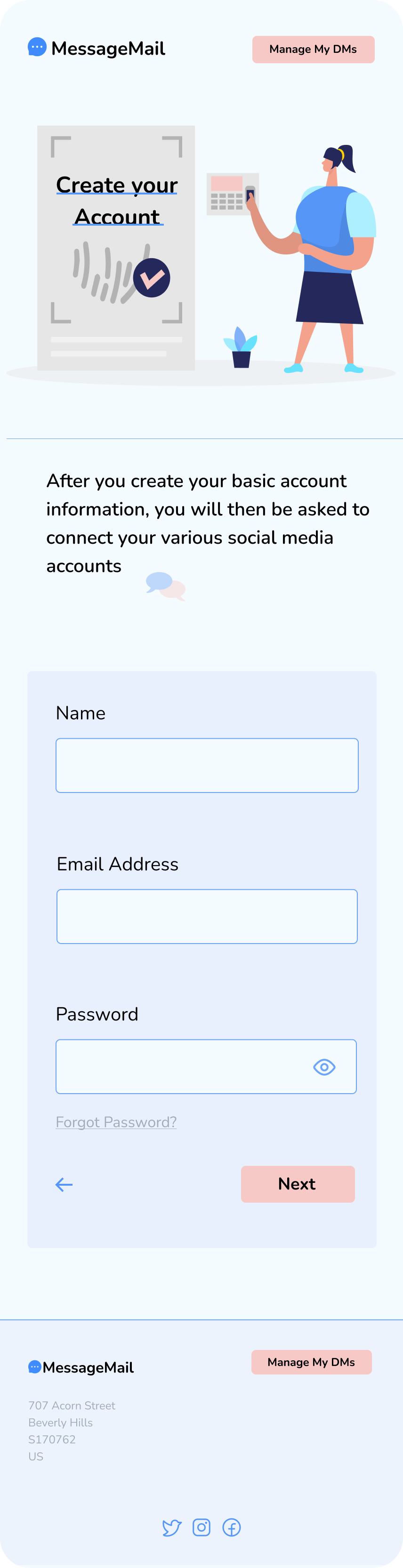 My goal was to create a landing page for an app/site that connects all social media, so the user can reply to emails from one location. For this to become a reality, I started intense and deep research, from studying how to design a beautiful and easy-to-use interface for a younger audience to making MessageMail a worldwide-known application and website.